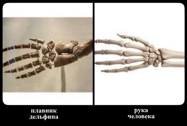 Сходство между руками человека и плавниками дельфина иллюстрирует конвергентную эволюцию, когда неродственные виды независимо развивают сходные черты в ответ на сходные экологические вызовы.