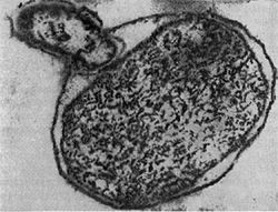 Наряду с паразитическими формами Bdellovibrio возникают сапрофитные, образующие желтый пигмент. Е. Н. Мишустину и Э. С. Никитиной удалось доказать, что часть паразитов, выбравшись из обломков разрушенной ими клетки-хозяина, переходит не к сапрофитному способу питания, а в состояние покоя, образуя цисты. Это овальные, почти круглые клетки с уплотненной ядерной зоной и толстой оболочкой. Размеры их необычайно малы, и они оставались не замеченными многими микробиологами (рис. 26).